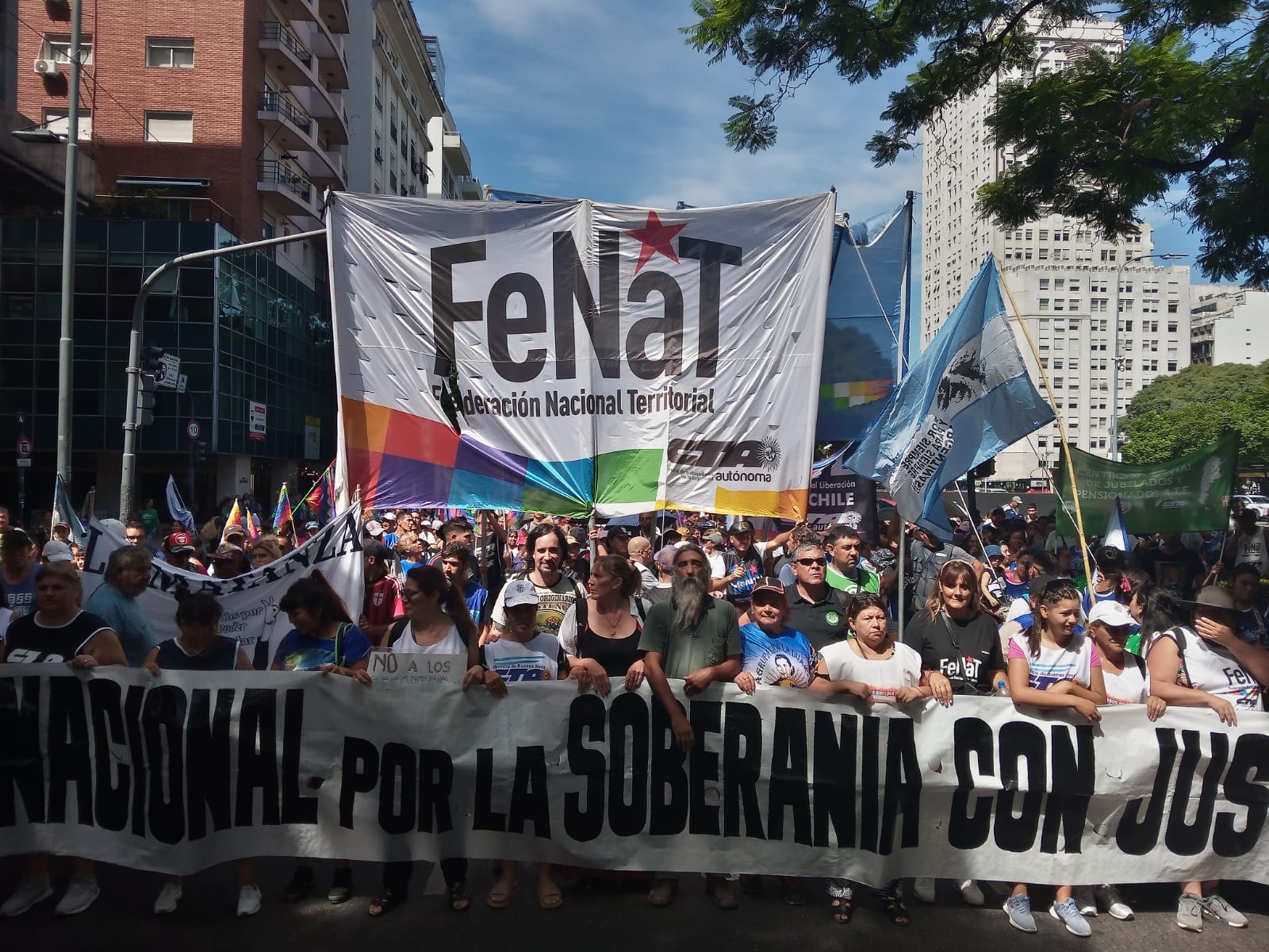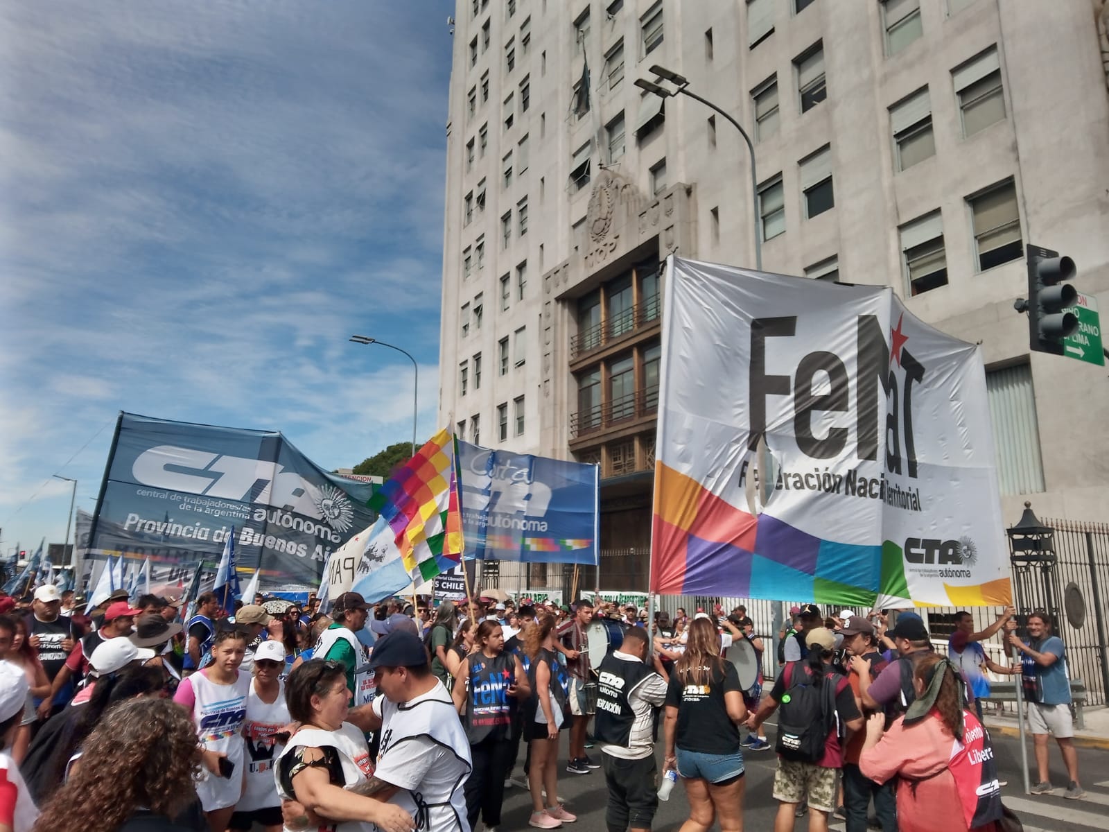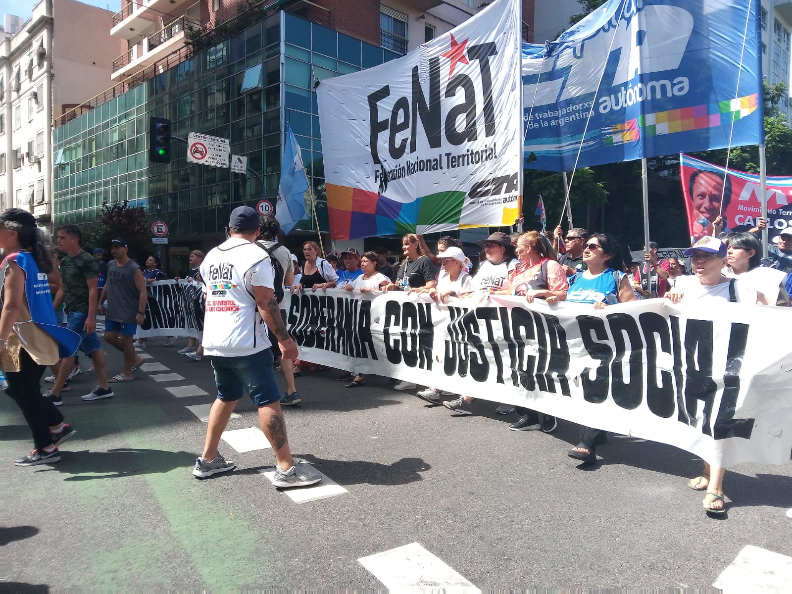 Cerrando esta parte de del acto, previo a la marcha de la columna hacia el ministerio de economía, Omar Giuliani, Secretario General de la FeNaT, expuso que “este es el reclamo histórico de las trabajadoras y los trabajadores que somos capaces de construir políticas públicas en términos cotidianos en nuestros barrios. Somos esa clase trabajadora que es consiente pero que necesita construir poder popular, porque es claro y es justo nuestro reclamo de asistencia a nuestros espacios comunitarios. Es claro cuando elevamos la voz ante la obsenidad de los seis millones de pibes y pibas bajo la línea de pobreza, pero está claro también que no podemos delegar, que debemos construir fuerza organizada capaz de llevar a un compañero o compañera de la clase a discutir, a definir las políticas de nuestro país”.