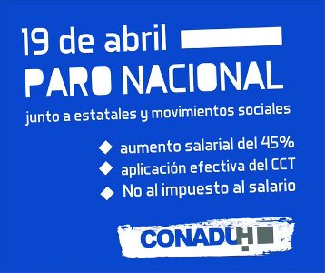 Como ya fuera informado por ACTA, el Congreso de la Federación Nacional de Docentes, Investigadores y Creadores Universitarios (CONADU Histórica) que sesionó el viernes en la Carpa Blanca frente al Ministerio de Educación, resolvió parar el 19 de abril, en coincidencia con la Jornada de Lucha y Movilización de la CTA Autónoma, el paro de los estatales y la movilización de las organizaciones sociales, en contra de los despidos por paritarias libres y trabajo genuino.