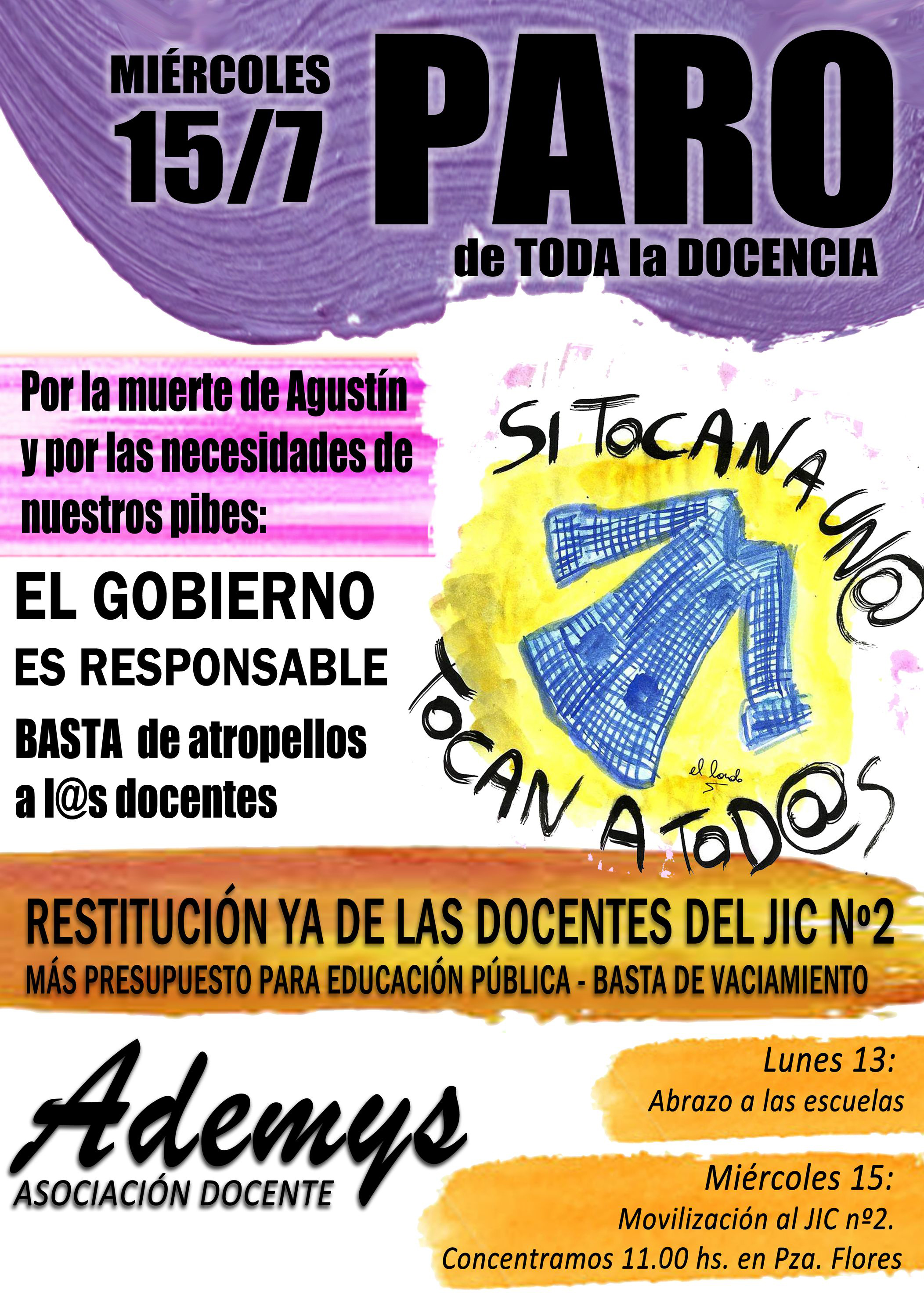 La medida de fuerza se realizará bajo las consignas: “Si tocan a un@, tocan a tod@s. Por la muerte de Agustín y por las necesidades de nuestros pibes: El Gobierno es responsable, basta de atropellos a l@s docentes. Restitución ya de las docentes del JIC Nº2. Más presupuesto para la Educación Pública, basta de vaciamiento”.
