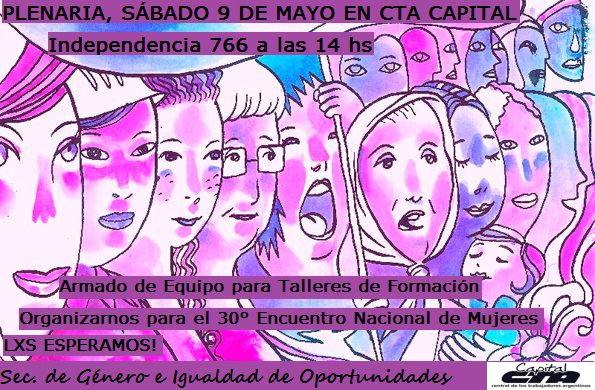 La Secretaría de Género e Igualdad de Oportunidades de la CTA Capital convoca a participar el próximo sábado 9 de mayo a partir de las 14 horas, de una Plenaria, en la sede de la Central porteña -Avenida Independencia 766-. En la misma se realizará el armado de Equipo para Talleres de Formación y se comenzará a trabajar en la organización del 30º Encuentro Nacional de Mujeres.