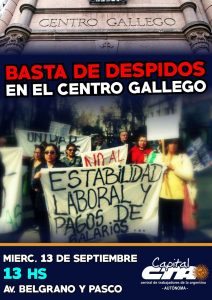 La Comisión Directiva del Sindicato de la Salud, integrante de la CTA autónoma, denuncia la política persecutoria puesta de manifesto por los interventores del Centro Gallego de Buenos Aires contra activistas, delegados y dirigentes del Sindicato.