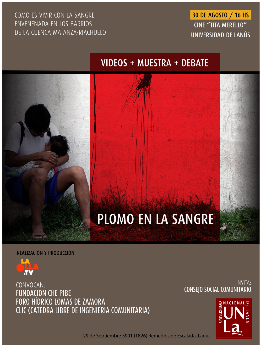 El próximo martes 30 de agosto a las 16 horas en el Cine – Auditorio «Tita Merello» de la Universidad de Lanús, se proyectará la serie documental «Plomo en la sangre», realizada por laolla.tv, con participación de vecinos, organizaciones y especialistas. Acompañará la presentación una muestra fotográfica. El evento es promovido por el Consejo Social Comunitario de la Universidad Nacional de Lanús y convocan y participan del mismo la Fundación Che Pibe, el Foro Hídrico Lomas de Zamora y la CLIC (Cátedra Libre de Ingeniería Comunitaria).