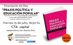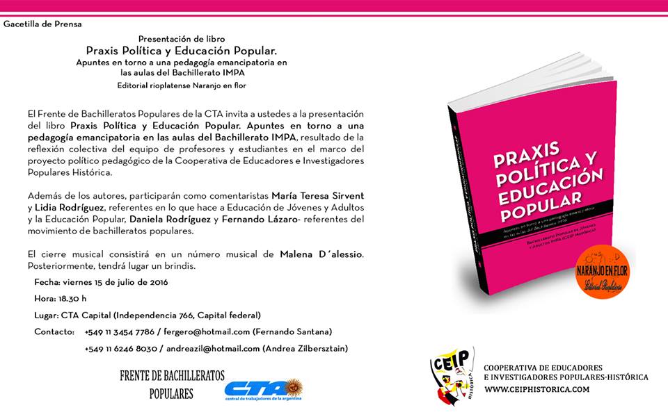 13590360_10210053918249705_321476074674020482_n (1)El Frente de Bachilleratos Populares de la CTA presentará este viernes 15 de julio a las 18.30 horas el libro “Práxis Política y Educación Popular. Apuntes en torno a una pedagogía emancipatoria en las aulas del bachillerato IMPA”, en la sede de la Central porteña, Avenida Independencia 766.