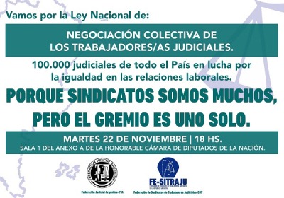 El gremio de los judiciales, representados en 27 sindicatos de trabajadores judiciales de todo el país agrupados en la Federación Judicial Argentina (CTA-Autónoma) y la Federación de Sindicatos de Trabajadores Judiciales de la República Argentina (CGT) presentarán en el Congreso Nacional un proyecto de ley para regular la negociación colectiva de los más de 100.000 trabajadores judiciales de todo el país.