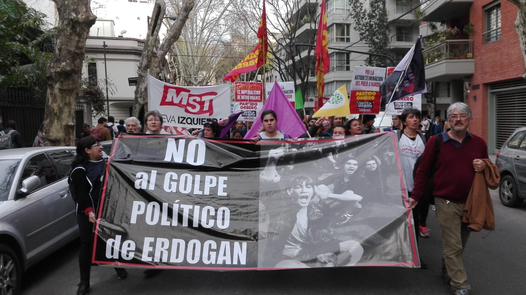 Este lunes un centenar de personas protestaron frente a la Embajada de Turquía en Buenos Aires en repudio a la destitución de tres alcaldes del Partido Democrático de los Pueblos (HDP) elegidos hace cinco meses por el voto popular. “Debemos alzar la voz para denunciar la represión del gobierno de Recep Tayyip Erdogan contra el pueblo kurdo”, pidió la dirigente de la CTA-Autónoma, Margarita Noia.