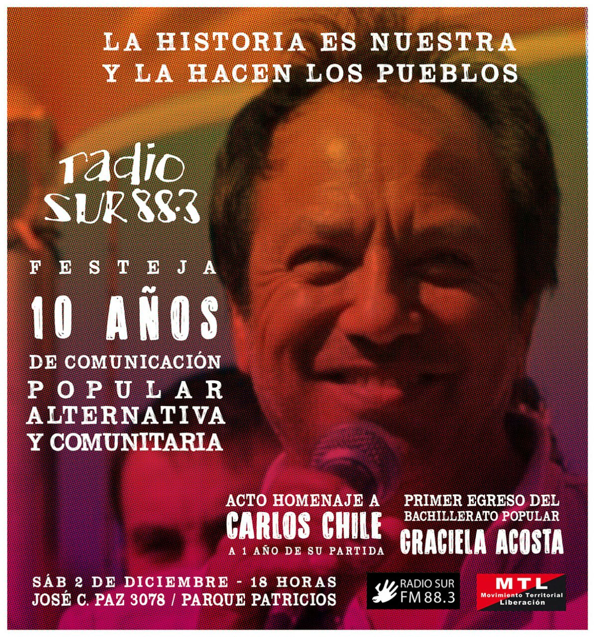 Hoy sábado 2 de diciembre a partir de las 18 horas en José C. Paz 3078, Parque Patricios, en el corazón de Monteagudo, Radio Sur FM 88.3 festeja 10 años de Comunicación Popular Alternativa y Comunitaria.
