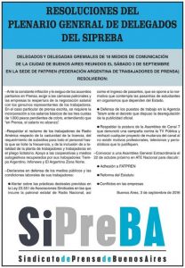 Delegados y delegadas gremiales de 18 medios de comunicación de la Ciudad de Buenos Aires reunidos el sábado 3 de septiembre en la sede de FATPREN (Federación Argentina de Trabajadores de Prensa) resolvieron varios puntos.