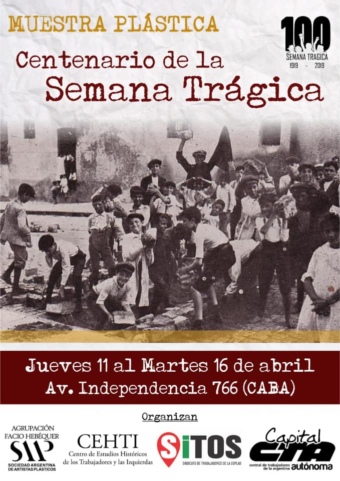 Mañana jueves 11 de abril a las 18.30 horas se inaugurará en la sede de la CTAA Capital -Avenida Independencia 766- la Muestra Plástica ‘Centenario de la Semana Trágica’. La misma está organizada por la Agrupación Facio Hebéquer, el Centro de Estudios Históricos de los Trabajadores y las Izquierdas, él SiTOS y la CTAA Capital y podrá visitarse hasta el martes 16 de este mes.