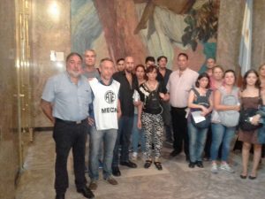 La reunión se realizó en los accesos del edificio de Hipólito Yrigoyen 250, para garantizar el ingreso de tod@s l@s despedid@s, a los que desde hoy se les bloqueó la tarjeta de entrada.