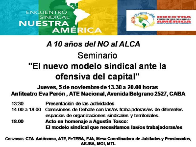A 10 años del NO al ALCA se realizará el 5 de noviembre en la ciudad de Buenos Aires el seminario del Capítulo Argentino del ESNA “El nuevo modelo sindical ante la ofensiva del capital”. A las 18, Homenaje a Agustín Tosco.