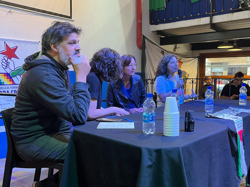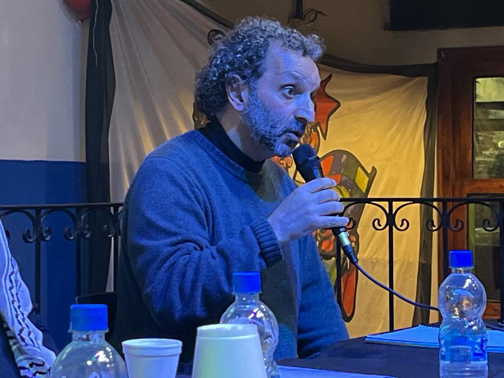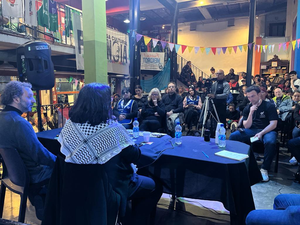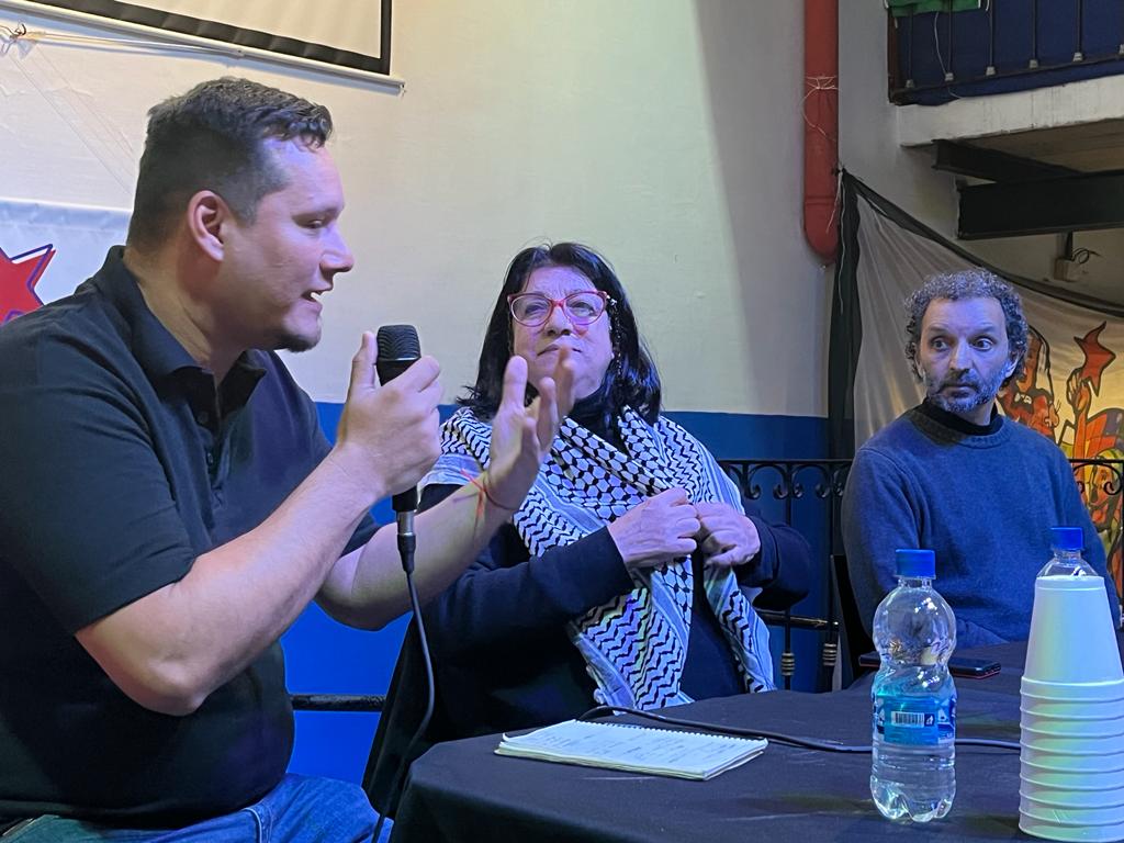 Luego de la exposición de las y los compañeros de Fuera Mekorot, Franco Armando, secretario de Organización de la CTA Capital y moderador de la charla realizó una apertura formal y presentó al panel de invitados: “Esta actividad estaba dentro de una serie de charlas que veníamos organizando para hablar un poco de nuevas expresiones políticas y lo teníamos en agenda semanas antes de que se desarrollaran los últimos acontecimientos. Este sentimiento de solidaridad hacia el pueblo palestino no es algo reciente. Nuestro espíritu solidario con los pueblos que luchan contra el imperialismo es una premisa importante de nuestra organización”.