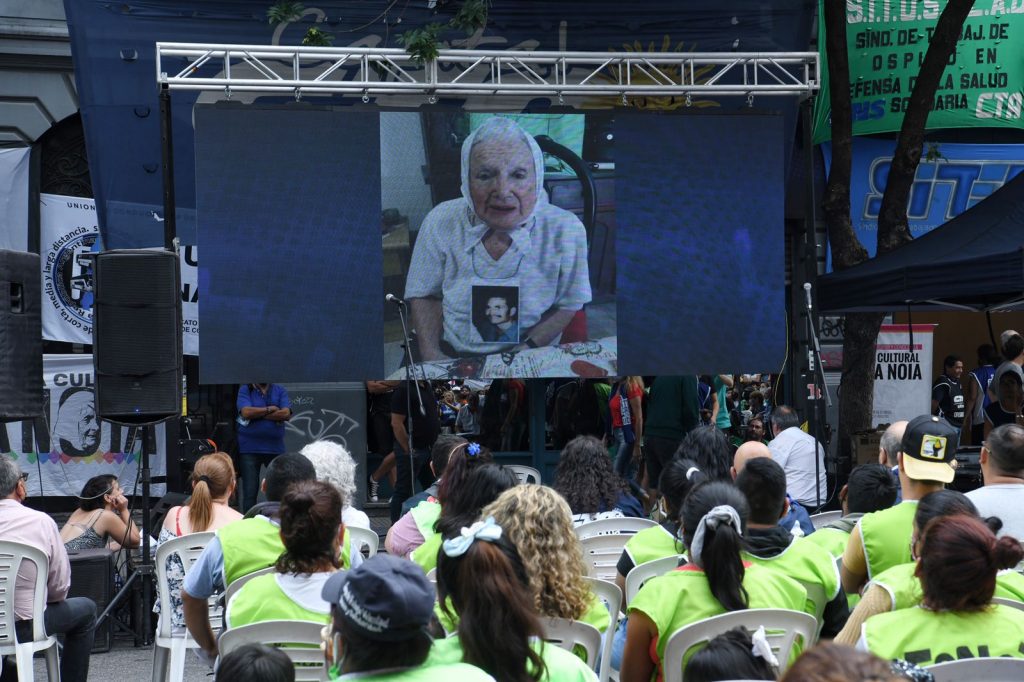 Posteriormente, se proyectó en la pantalla, un saludo en video de Nora Cortiñas, referente de Madres de Plaza de Mayo Línea Fundadora, quién dijo: “En este día especial quiero saludar a los compañeros y compañeras y expresarles que es importante que tengamos claro que tenemos que combatir el hambre, y para eso lo primero y principal es decirle «No al Fondo Monetario Internacional», le decimos que no a pagar una deuda que no debemos, esta deuda la tienen que pagar los que la hicieron. Mi corazón acompaña este Congreso y espero que sea un éxito”.