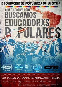 Los Bachilleratos Populares Salvador Herrera (Lugano), Sol del Sur (Piletones), Alberto Chejolán (Villa 31) y Miguelito Pepe (Constitución), nucleados en la Central porteña, comienzan el ciclo lectivo 2019 en marzo y están incorporando educadorxs a sus equipos pedagógicos. Los talleres, que se realizan en conjunto entre los cuatro bachis, se proponen formar a aquellxs interesadxs en ser parte de estas experiencias de educación secundaria de jóvenes y adultxs en las que se trabaja desde la perspectiva de la Educación Pública Popular. Los bachis son escuelas construidas como espacios de militancia, autogestionados, con una gran impronta territorial y feminista.