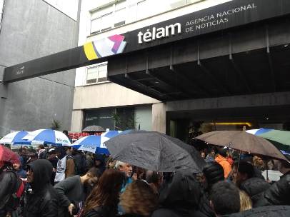 La persistente lluvia de la tarde no impidió que pasado el mediodía, un arco político, social, gremial y periodístico del más amplio espectro, se reuniera frente a las puertas de Telam, en pleno barrio de San Telmo para denunciar los despidos de un editor y de una editora de la Agencia así como el vaciamiento de los medios públicos y el intento de disciplinamiento a la organización sindical.