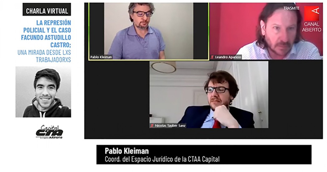 Organizada por el Espacio Jurídico de la CTAA Capital, ayer por la tarde se llevó a cabo -a través de videoconferencia- la disertación virtual titulada “La represión policial y el caso Facundo Astudillo Castro”. Participaron de la charla Leandro Aparicio, abogado de la Familia de Facundo Astudillo Castro y Nicolás Tauber Sanz, abogado de una de las querellas en la causa de Santiago Maldonado, coordinador de Liberpueblo y parte de la asesoría Jurídica de la CTAA Nacional.