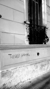 Sobre la Avenida Caseros, a pocos metros de Defensa, un grafiti sencillamente improvisado en la pared de un viejo caserón de San Telmo, asalta la atención dormida de cualquier transeúnte: “Tengo hambre”.
