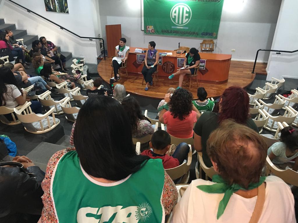 Promediando la asamblea llegaron al anfiteatro Silvia León, secretaria de Género de la CTAA y Nina Brugo, compañera histórica de la Campaña Nacional por el Derecho al Aborto Legal, Seguro y Gratuito, quienes venían de participar de la Conferencia de Prensa convocada por la Campaña, para decir “basta de tortura, cesárea no es ILE”.