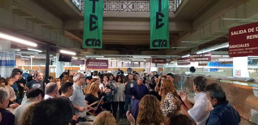 “Al enterarnos del Decreto empezamos con acciones en la mesa de entradas del edificio de la calle Venezuela (foto de portada), informando a la gente de los riesgos, intercambiando opiniones, y la medida de fuerza la realizamos haciendo que no salga la documentación que ingresaba: al no salir ningún certificado, ningún informe, se corta el circuito inmobiliario, que también lo utilizan los bancos para los créditos hipotecarios e internos”, resalta Bravo de ATE-Registro de Propiedad Inmueble.
