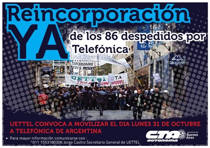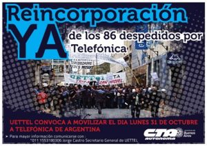 Este lunes 31 de octubre, la Unión de Empleados y Técnicos de Telecomunicaciones (UETTel-CTA), movilizará a Telefónica de Argentina para volver a exigir que se reincorpore a los 86 trabajadores despedidos. ACTA habló con Jorge Castro, Secretario General de la organización y Secretario Gremial de la CTA Autónoma bonaerense.