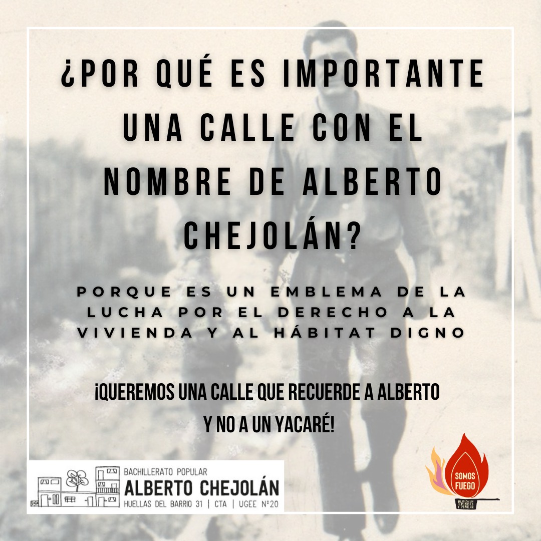 Una calle con su nombre porque a lo largo de casi 90 años de historia, el barrio se ha ocupado muy bien de mantener viva la memoria, porque Alberto Chejolán fue un vecino activo y participativo, un emblema de la lucha por la vivienda, asesinado en su defensa. Una calle con su nombre porque fue víctima de la represión policial y su reconocimiento forma parte de la necesaria reparación histórica para su familia y vecinas y vecinos, porque su asesinato marcó un punto de inflexión en la historia del barrio, precedente de la violenta erradicación llevada adelante por la dictadura terrorista. Una calle con su nombre, porque su barrio no lo olvida.