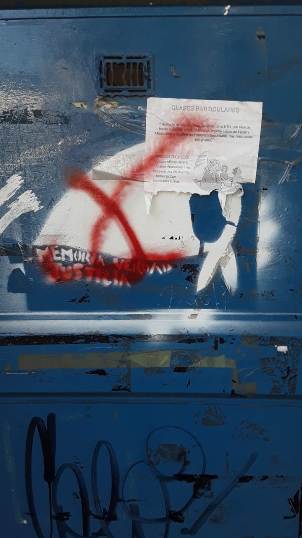 Los pañuelos blancos que simbolizan la resistencia y lucha de Las Madres fueron cruzadas con una X de color rojo en el edificio de «Sol de Floresta» donde funciona el Bachillerato Popular “Sergio Karakachoff”, el Centro Cultural “70 Locos y Ningún Balcón» y la Fundación “Autismo Buenos Aires” de la Organización Germán Abdala de la CTA Autónoma.