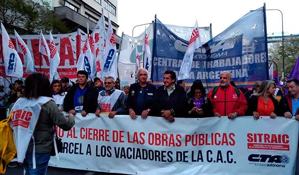 Pasadas las 10.00, una gran columna de trabajadores y trabajadoras del Sindicato de Trabajadores de la Industria de la Construcción (SITRAIC-CTA-A), junto con organizaciones de la Central y con la adhesión de un importante número de agrupaciones sindicales hermanas, realizó en la Ciudad de Buenos Aires una importante movilización que incluyó el paso por la sede de Vialidad Nacional y los ministerios de Transporte y Economía, para terminar luego en un acto en la Cámara Argentina de la Construcción.