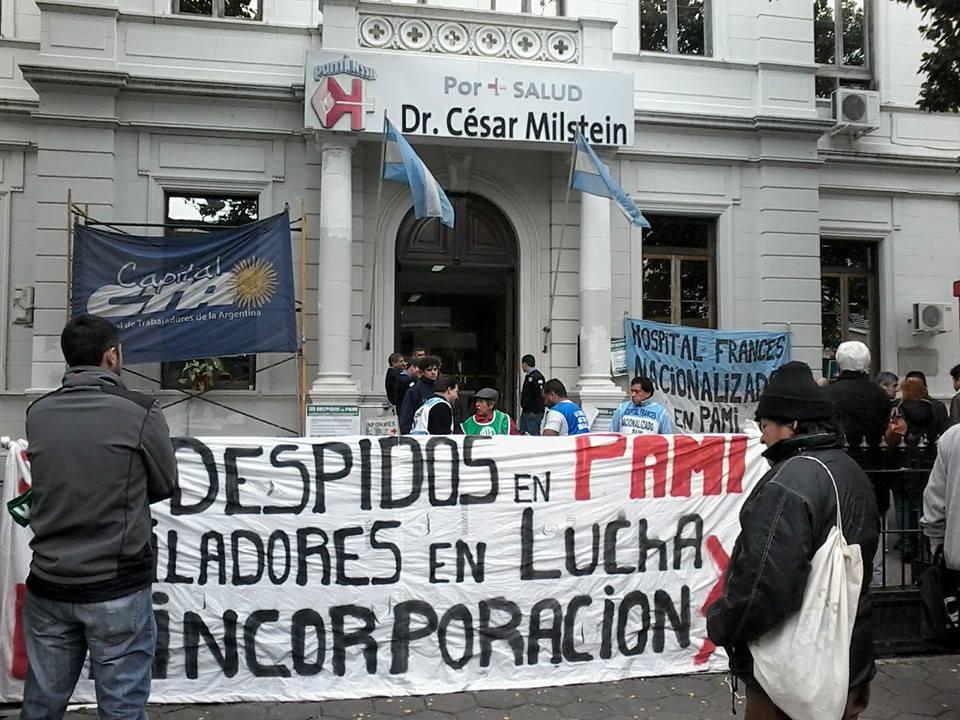 A partir de esa fecha, en colaboración con la Junta Interna de ATE PAMI en el ex Hospital Francés, empezamos la lucha por la reincorporación de los 30, que se fue prolongando hasta ahora. De tanto ir al PAMI Central, al Ministerio de Trabajo, los compañeros pudieron conseguir trabajo, que esperemos sea en el Hospital Francés, como corresponde. Pero la situación económica hacía que no se podía sostener más la lucha, porque los compañeros hacía casi 5 meses que no cobraban.