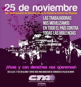 Como todos los años, desde la CTA Autónoma le decimos NO a la violencia contra las mujeres. Así como estuvimos en la jornada por el Ni una menos el 3 de junio de 2015 y 2016 y protagonizamos el paro de mujeres del pasado 19 de octubre, este viernes nos concentramos a las 17.00 horas en Alsina y Entre Ríos de la Ciudad Autónoma de Buenos Aires para marchar a Plaza de Mayo.