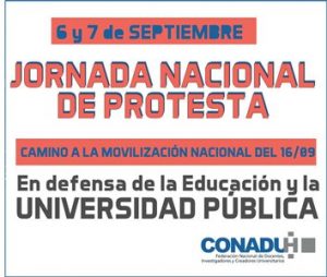 Con el objetivo de dar a conocer nuestros reclamos y preparar las movilizaciones del 16 de septiembre en todo el país, las asociaciones de base de la CONADU Histórica realizarán este martes y miércoles, una jornada Nacional de Protesta y Difusión.