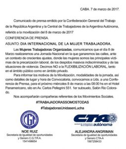 En un comunicado de prensa firmado por Alejandra Angriman, Secretaria de Género de la CTAA y Noe Ruíz, Secretaria de Género de la CGT, ambas centrales sindicales convocan a la movilización del 8 de marzo en el marco del Día Internacional de las Mujeres Trabajadoras y a una Conferencia de Prensa ese mismo día a las 8 de la mañana en el Hotel Panamericano (Carlos Pellegrini 551). La conferencia contará con la presencia de mujeres referentes de movimientos sociales.