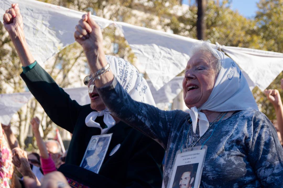 Nora Cortiñas, Madre, mirando a los presentes de manera dulce, continuó: “Pero nosotras, gracias a ustedes, les demostramos que, cada día que se va, renacemos. Nos sentimos acompañadas por todos ustedes y, por eso, nosotras, si algún día perdiéramos el rumbo, les pedimos que nos lo digan. Si vieran que alguna de nosotras nos vamos equivocando, llámennos. Nosotros pensamos seguir con nuestros principios desde el primer día y seguir adelante para demostrar que nosotros no somos para nada igual a los represores, torturadores y canallas”.