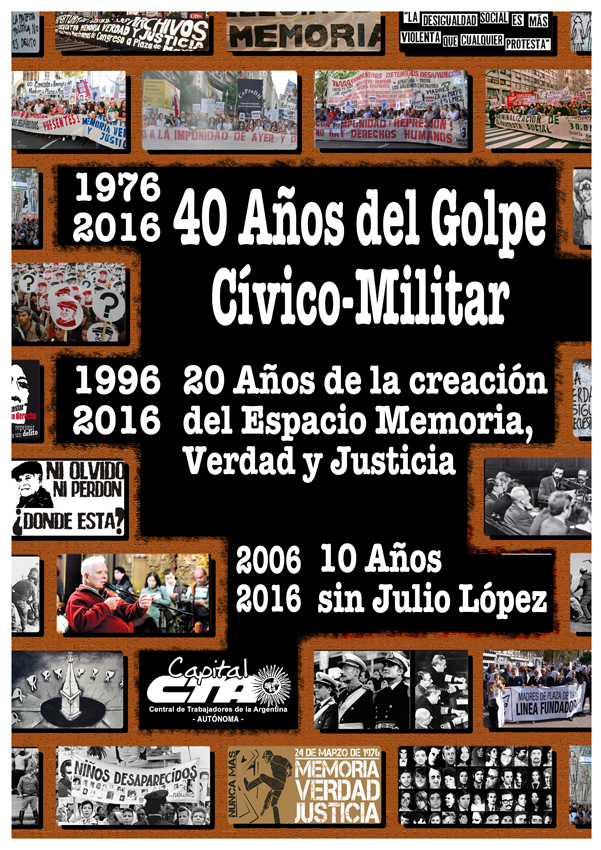 Al cumplirse 40 años del último Golpe Cívico Militar, la CTA Capital organizó una serie de actividades para mantener viva la memoria. Las mismas comenzarán el próximo 16 de marzo, en la sede de Avenida Independencia 766 y finalizarán el jueves 24, día en que la Central porteña convoca a marchar hasta la Plaza de Mayo, junto a la CTA Provincia de Buenos Aires y al espacio de Memoria, Verdad y Justicia.