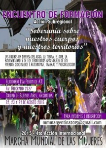 Con la Coordinación de la CTA Autónoma, La Marcha Mundial de las Mujeres Capítulo Argentino convoca al encuentro de formación “Soberanía sobre nuestros cuerpos y nuestros territorios” a realizarse en el Auditorio Eva Perón de ATE Nacional (Avenida Belgrano 2527, de la Ciudad de Buenos Aires) los días 22, 23 y 24 de agosto.
