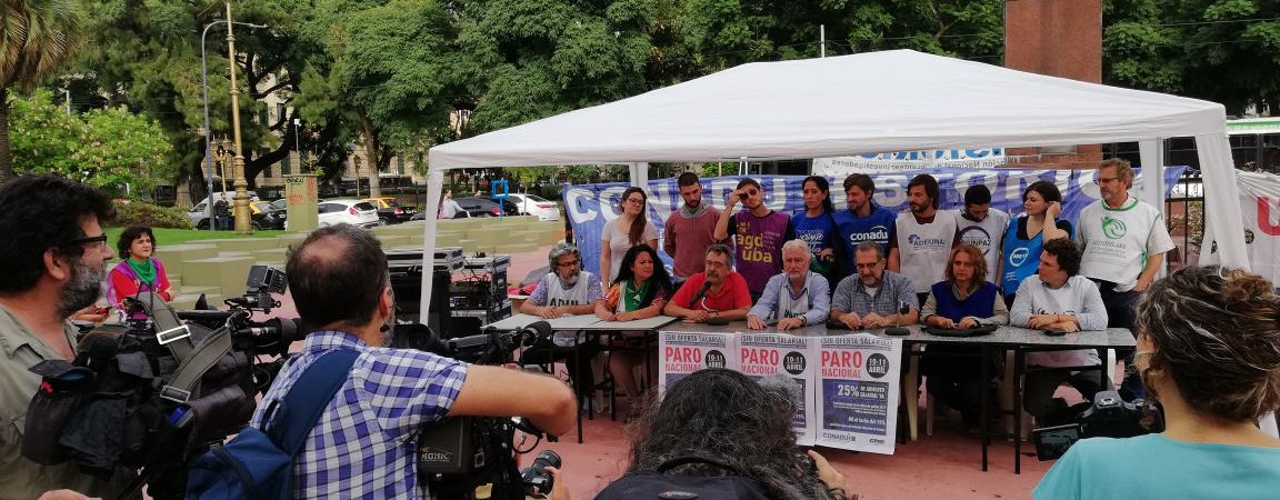En el marco del inicio del plan de lucha con paro de 48 horas de la docencia universitaria y preuniversitaria por una recomposición salarial del 25%, se realizó esta mañana una conferencia de prensa conjunta de CONADU Histórica y CONADU, frente al Ministerio de Educación de la Nación.
