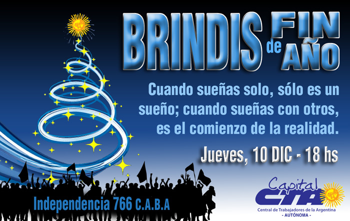Brindis (Cuando suenÞas) para pagina CTAInvitamos a la militancia de la CTA Autónoma de la Ciudad de Buenos Aires a participar del brindis de fin de año que se llevará a cabo este jueves 10 de diciembre a las 18 horas en la sede de Independencia 766.