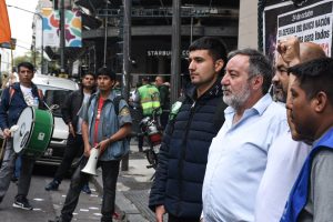 Estuvo presente José “Pepe” Peralta, secretario Adjunto de la CTAA Capital, quien dijo: “Todos sabemos que la lucha que están llevando no ha tenido ninguna respuesta, lejos de ella, el sindicato que se encuentra intervenido ha desfavorecido a las y los trabajadores. La lucha que hacen en las calles, hoy en las puertas del ministerio, justamente tiene que marcarles que no están solos y que no pueden hacer lo que ellos quieran. Estamos dispuesto a seguir adelante y a seguir convocando a más compañeras y compañeros a la lucha. Venimos de una jornada trágica la de ayer, por cómo el Gobierno continúa manipulando a los medios para que muestren a las y los trabajadores como si fuéramos delincuentes golpistas, y no es así, queremos vivir dignamente. Por eso hoy estamos acá para pedir a los funcionarios que nos reciban y nos den respuestas a los reclamos”