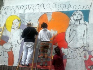 El grupo que hace más de un mes se viene reuniendo en el “Centro Cultural Leopoldo Gonzalez” de ATE Capital salió a realizar su primera experiencia colectiva a la calle. A metros de la Casa Base del MOI (Movimiento de Ocupantes e Inquilinos) que les abrió sus puertas y sumó compañeros a la tarea de construir colectivamente un mural.