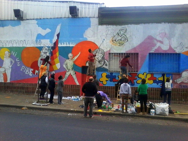 Caras pintadas, cuerpos cansados y rostros felices al final de un sábado que se puso frío pero que dejó una pared llena de color allá en el sur de la Ciudad de Buenos Aires, en Carrillo al 500.