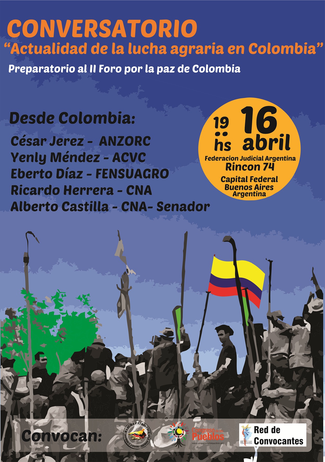 Este jueves 16 de abril a las 19 horas en la sede de la Federación Judicial Argentina (FJA-CTA), ubicada en Rincón 74, se realizará una charla-debate con delegados y delegadas de organizaciones campesinas colombianas que asisten al VI Congreso de la CLOC-Vía Campesina.