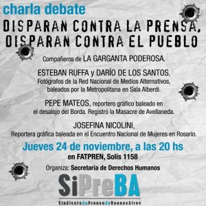 Participarán compañeros de La Garganta Poderosa junto con Esteban Ruffa y Darío de los Santos, fotógrafos de la Red Nacional de Medios Alternativos baleados por la Policía Metropolitana en la Sala Alberdi.