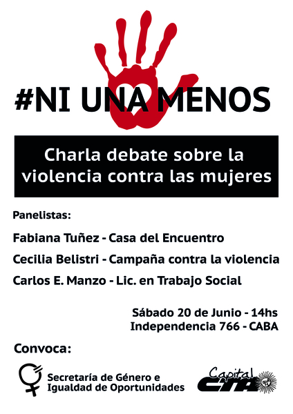 La Secretaría de Género e Igualdad de Oportunidades de la CTA Capital invita a participar de la Charla debate sobre la violencia contra las mujeres, que se llevará a cabo el próximo sábado 20 de junio a partir de las 14 horas en la sede de la Central porteña -Avenida Independencia 766-.