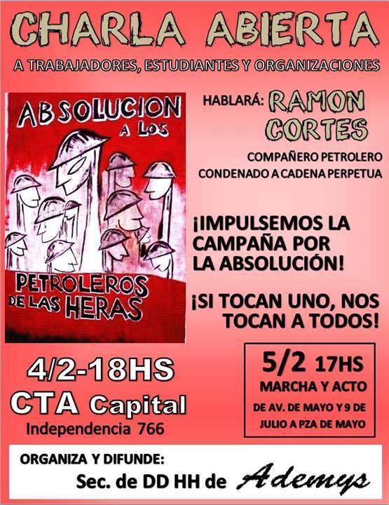 En Independencia 766, este martes 4 de febrero a las 18 horas se llevará a cabo una actividad en el marco de la campaña que exige la absolución de los trabajadores presos de Las Heras condenados a cadena perpetua sin ninguna prueba y violando sus derechos básicos. La actividad está organizada por la Secretaría de DDHH de Ademys y formará parte de la misma Ramón Cortes, uno de los compañeros condenados.