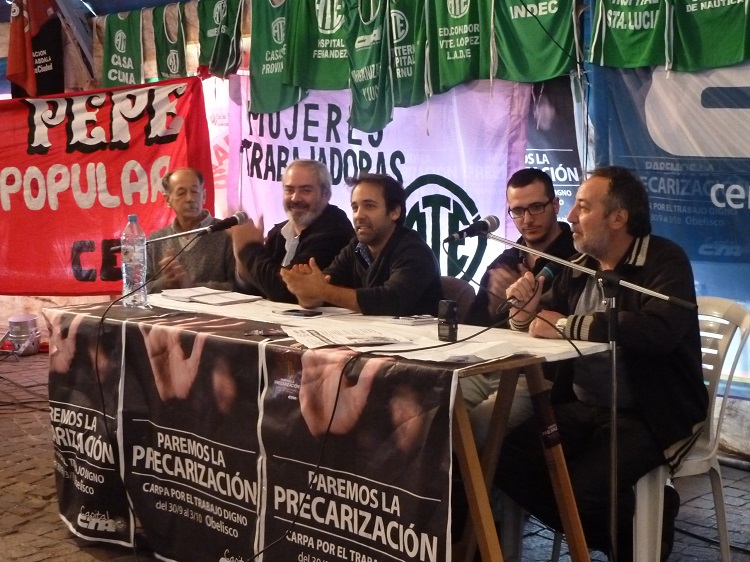 Como primera actividad del cuarto día de la Carpa por el Trabajo Digno, se llevó a cabo una charla coordinada por Martías Rey, integrante de la Comisión Gremial Interna del Banco Ciudad, en la que participaron Itai Hagman, de Patria Grande y Alejandro Bodart, Legislador Porteño por el MST.