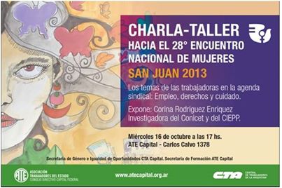 Este miércoles 16 de octubre a las 17 horas en la sede de ATE Capital (Carlos Calvo 1378) se llevará a cabo una charla taller sobre los temas de las trabajadoras en la agenda sindical. La actividad está organizada por la Secretaría de Género de la CTA Capital junto a la Secretaría de Formación de ATE Capital, con vistas al XXVIII Encuentro Nacional de la Mujer.