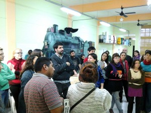 Una ronda, mates y una palabras sin muchas vueltas que abrieron la jornada de trabajo “somos compañeros/as de ATE, de la CTA que tenemos cosas para decir y creemos que el arte es una herramienta (…). Nuestras organizaciones construyen experiencias en los barrios todos los días y quieren contarlas en las paredes de sus barrios. Esta propuesta de formación pretende recorrer un camino con otros/a porque toda experiencia, cuando es colectiva es más rica por eso nos pone muy felices este arranque con ustedes, que han llegado desde distintos lugares, con distintas experiencias. Nuestro sueño es que podamos conformarnos como una grupo que pueda recorrer los barrios con los compañeros/as de las organizaciones y muralear las paredes de la ciudad…ya veremos, para nosotros es una apuesta. Sin dudas en estos encuentros vamos a aprender de ustedes y con ustedes y nos va a dar el envión que necesitamos para salir a pintar….”