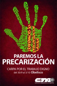 La CTA junto a otras organizaciones lanzan la Campaña por el Trabajo Digno, Paremos la Precarización! En el marco de esta iniciativa se instaló la Carpa por el Trabajo Digno frente al Obelisco (Av. Corrientes y 9 de Julio) que estará desde el martes 30 de septiembre hasta el viernes 3 de octubre.