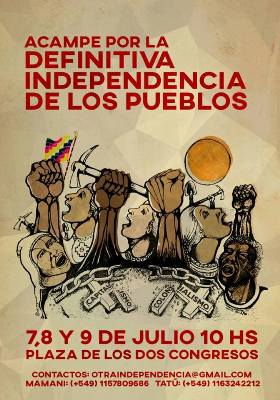 “El Bicentenario de la Independencia no será una fiesta triunfalista de las oligarquías estatales y empresarias ni de los buitres foráneos, sino un acampe indígena, negro, popular, libertario y americanista”, con esta consigna la CTA Autónoma junto a otras organizaciones del campo popular convoca a las tres jornadas programadas en la Plaza de los Congresos los días jueves 7, viernes 8 y finalización el sábado 9 de Julio con una gran marcha por el microcentro porteño.