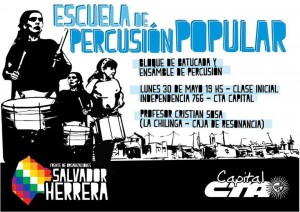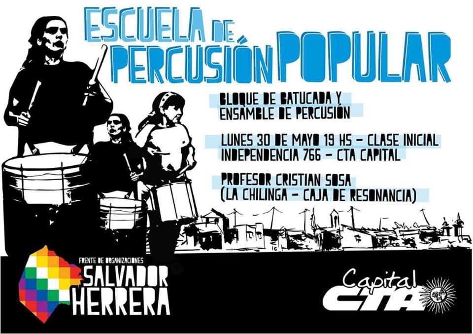 13336335_10209842811931384_1369007466_nEste lunes 30 de mayo a las 19 horas arranca en la sede de la Central porteña -Avenida Independencia 766- la Escuela de Percusión Popular (Bloque de Batucada y Ensamble de Percusión), organizada por el Frente Territorial Salvador Herrera. La inscripción aún se encuentra abierta.