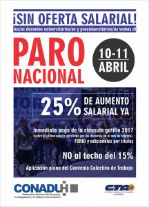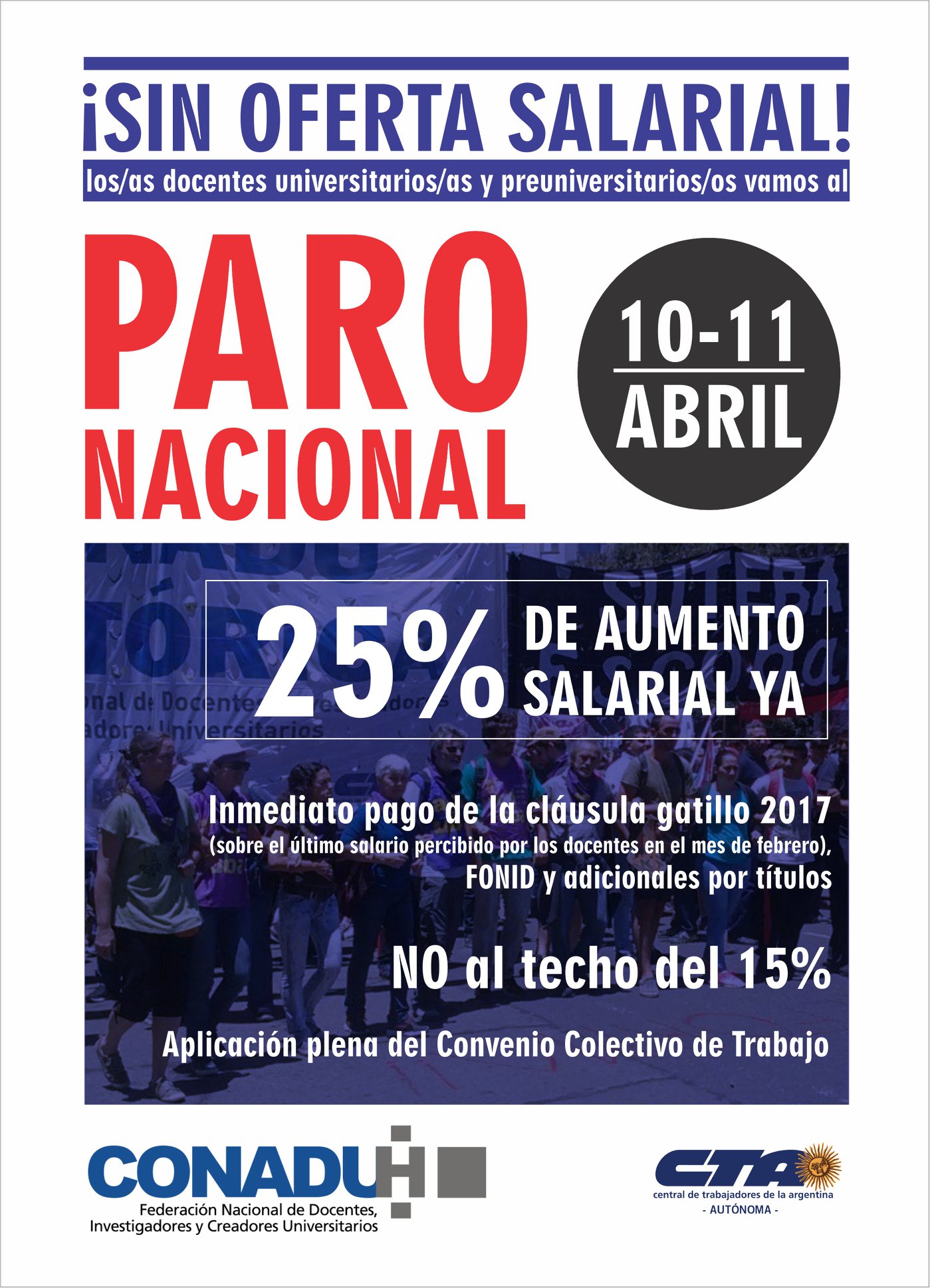 1. «Por unanimidad se rechazó el techo del 15% y se denunció como dilatoria la posición del gobierno nacional y los rectores en la paritaria, ya que luego de un mes de vencida la misma, no se ha hecho ninguna oferta salarial para 2018, no se ha pagado la cláusula gatillo correspondiente a 2017, ni las deudas salariales sobre el FONID o los títulos de posgrado.