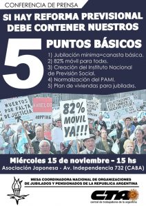 La Mesa Coordinadora Nacional de Organizaciones de Jubilados y Pensionados de la República Argentina brindará una conferencia de prensa sobre la reforma previsional que se aproxima. La misma tendrá lugar en Avenida Independencia 732 (Sede de la Asociación Japonesa) este miércoles 15 de noviembre de 2017, a partir de las 15 horas.